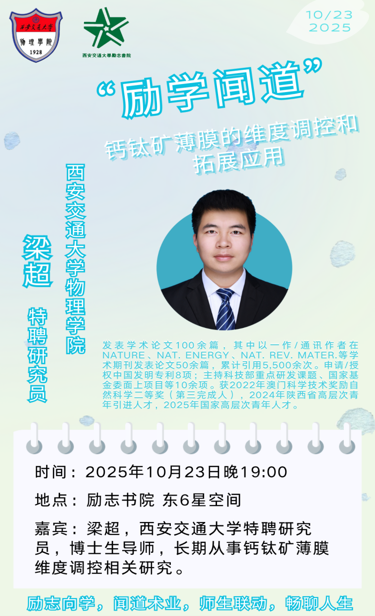 为充分发挥双院协同育人作用,更有效指导学生发展和提高,10月23日晚,励志书院联合物理学院举办第40期“励学闻道”教授进书院活动,由物理学院特聘研究员、博士生导师梁超老师主讲。