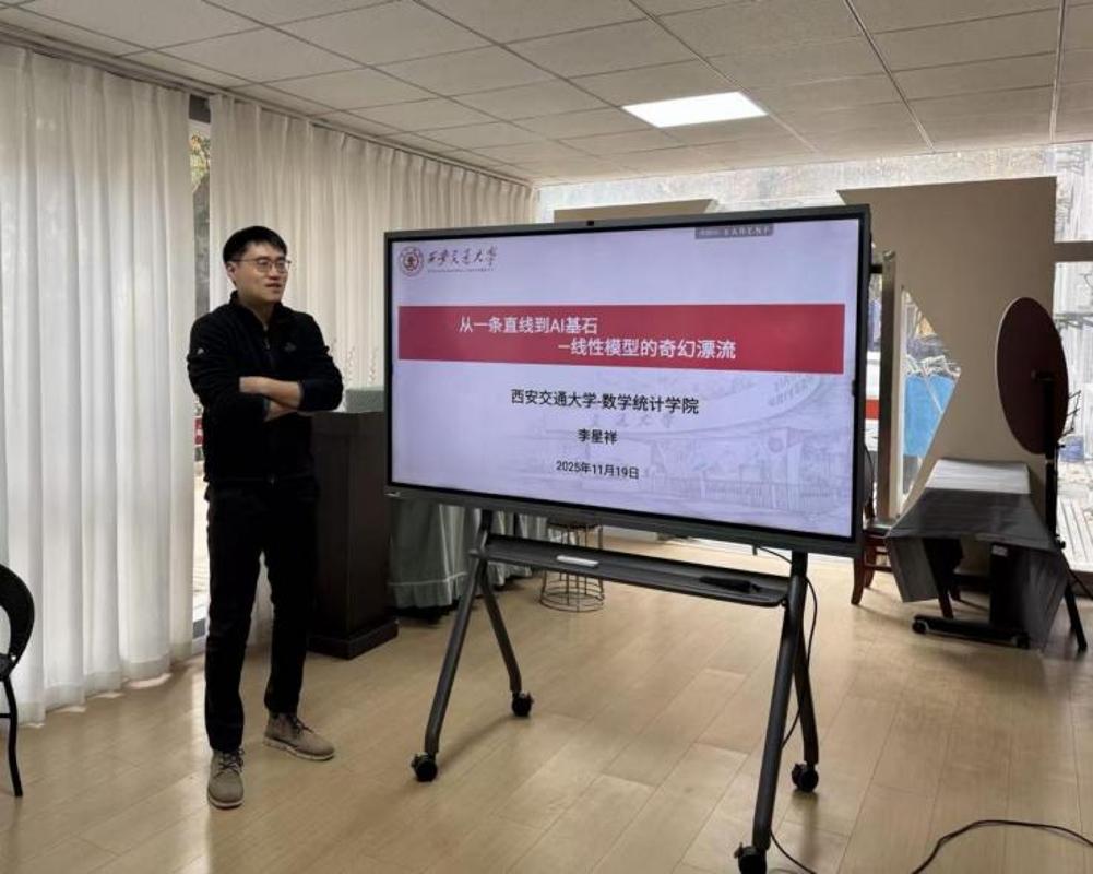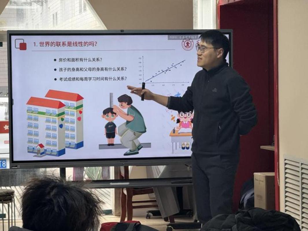 李星祥老师从父母与孩子的身高关系、股价与油价的变化趋势等生活中常见的现象引入,带领同学们认识“线性模型”的概念。他以贴近生活的例子展示了统计思想如何在日常世界中自然呈现,让大家意识到数学不仅存在于抽象的符号体系中,也深深嵌入真实的社会运行结构。