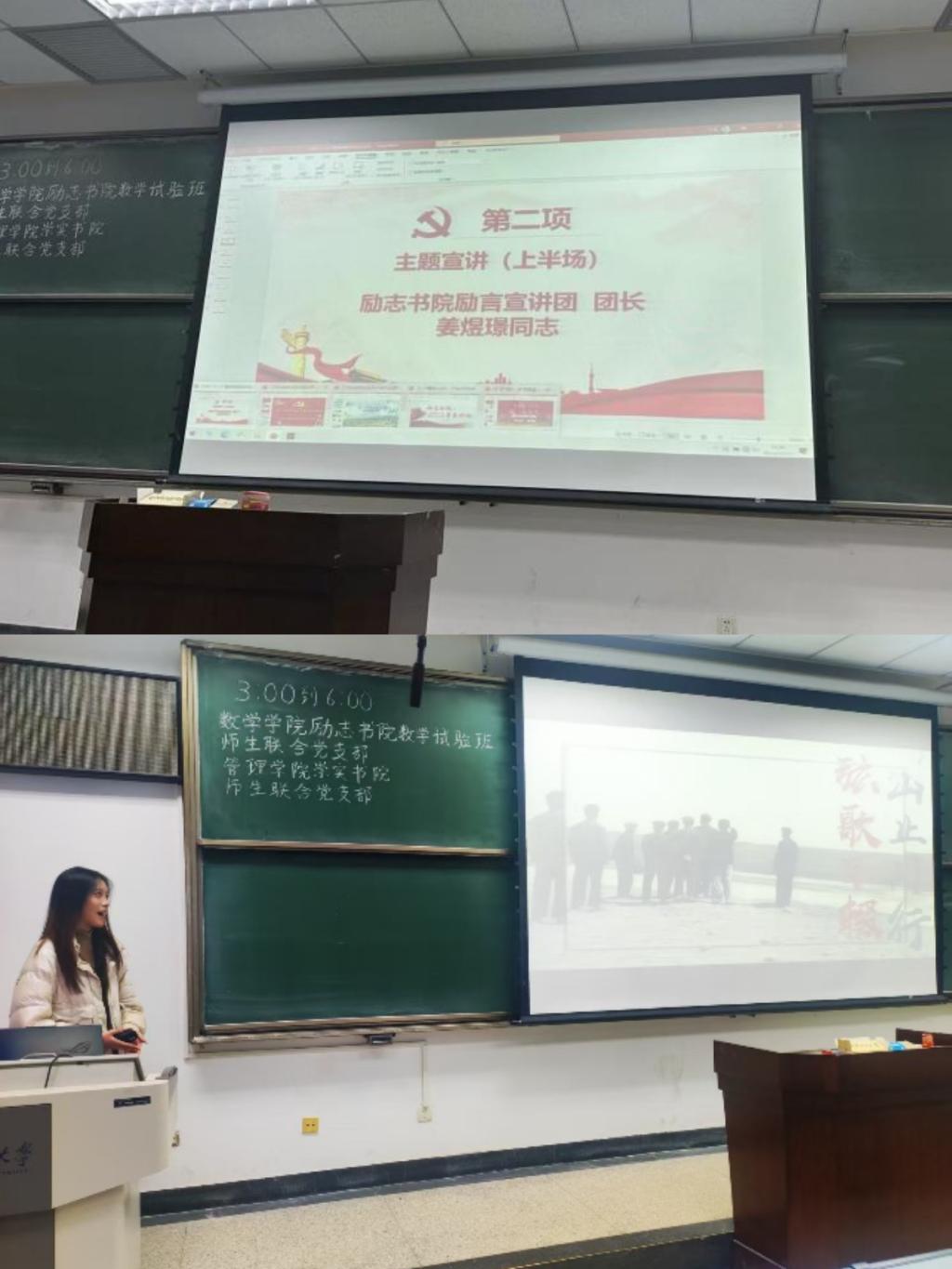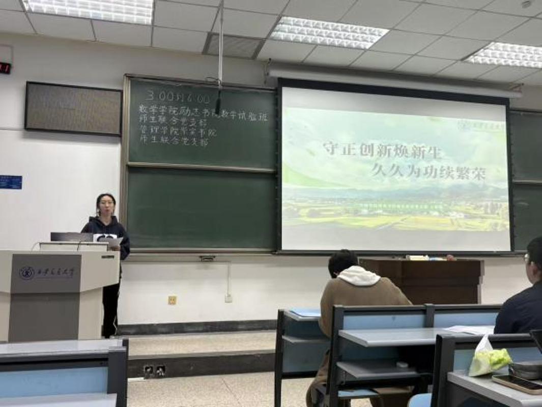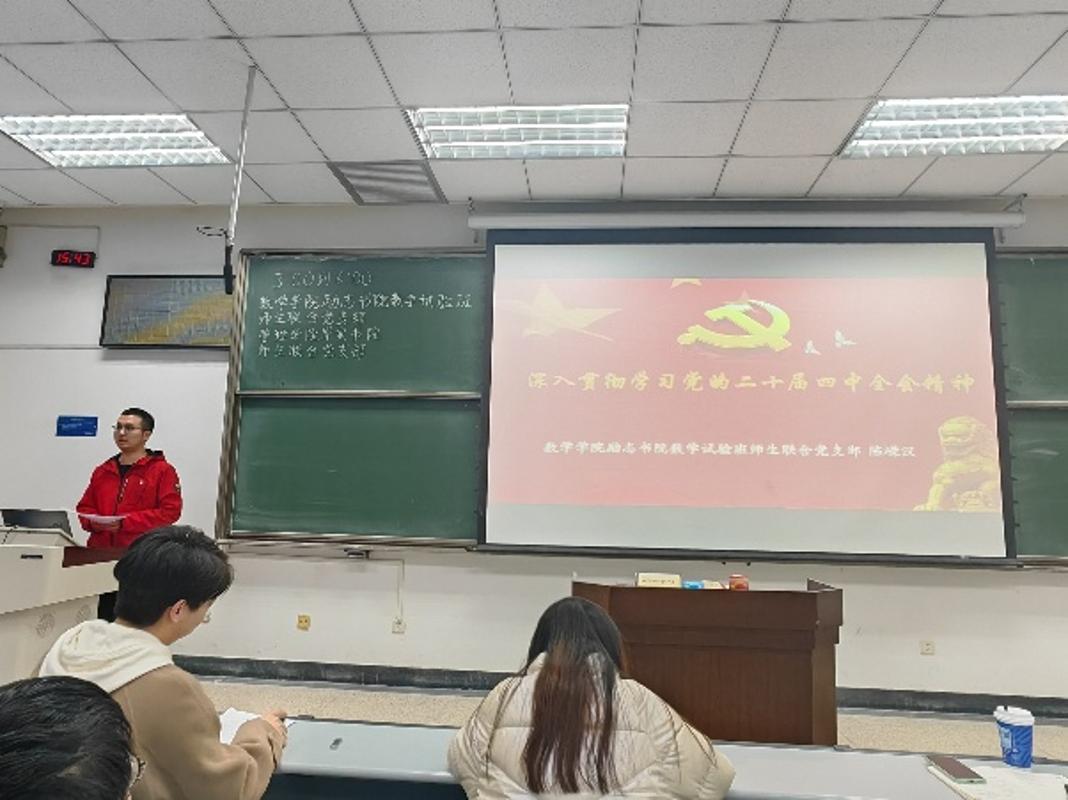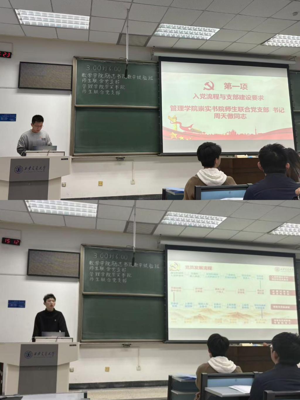 为深入学习贯彻党的二十届四中全会精神,推动跨学科、跨书院交流合作,数学学院励志书院数学试验班师生联合党支部与管理学院崇实书院师生联合党支部近日共同举办支部共建活动。内容涵盖入党流程与支部建设介绍、主题宣讲、党的二十届四中全会精神领学以及自由交流等多个环节,现场学习氛围浓厚,交流热烈。