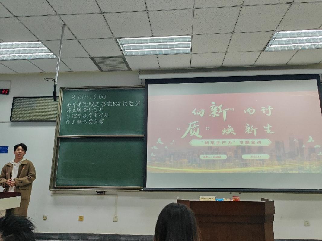 本次联建活动进一步深化了双方支部同志对党的二十届四中全会精神的理解。大家深刻认识到,在新征程上坚持党的领导、推动科技自立自强、构建现代化经济体系具有重大战略意义。此次交流共建,不仅为数学学院励志书院数学试验班师生联合党支部与管理学院崇实书院师生联合党支部搭建了宝贵的互动平台,也促进了理学思维与管理智慧的交叉融合,为今后持续合作、协同育人奠定了坚实基础。从西迁精神的薪火相传,到新质生产力的深入研讨,无不激励着我们以青春之我投身时代洪流。无论是攻坚“人工智能+”前沿领域,还是投身数智化乡村建设,我们都将牢记使命、勇立潮头,把个人奋斗融入国家发展,以实干实绩为推进中国式现代化贡献智慧与力量。