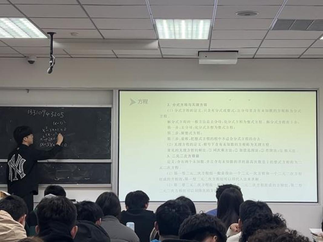 本次串讲邀请凝聚态2301班许涵宇与医电2302班李思澄两位学业优异的同学担任主讲。他们以清晰的逻辑和实用的经验,为同学们梳理《初等数学》第一章至第四章内容,给同学们带来了一场重点突出的复习指导,现场学习氛围浓厚。